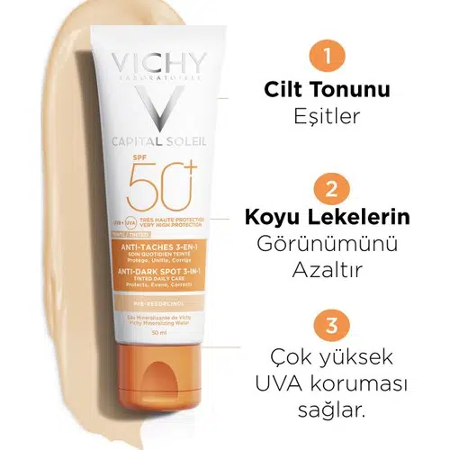 3 Etkili Leke Karşıtı Renkli Güneş Koruyucu Bakım: 1.Cilt tonunu eşitler. 2.Koyu lekelerin görünümünü azaltır. 3.Ciltte koruma sağlar. İçeriğindeki PhE-Resorcinol içeren formülü ile ciltteki lekelerinin görünümünü azaltmaya ve yeni lekelerin görünümünü engellemeye yardımcı olur. Güçlendirici ve yatıştırıcı Vichy Volkanik suyu içerir. Güneş ışınlarına karşı dayanıklıdır. Hipolerjeniktir.