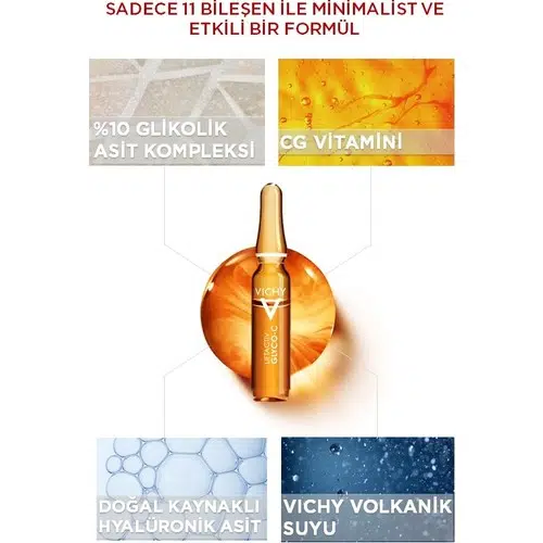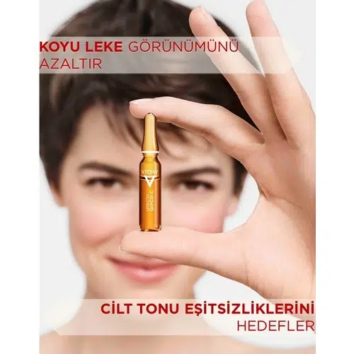 Vichy’den leke görünümünü, cilt tonu eşitisizliklerini ve ışıltı kaybını hedefleyen yeni ampuller. %10 Glikolik Asit Kompleksi ile birleştirilmiş güçlü Vichy Volkanik Suyu ve C Vitamini içeren formülü ile leke görünümünü azaltır. Leke görünümünü azaltan %10 Glikolik Asit Kompleksi, cilde ışıltı katan C vitamini, cildi nemlendiren ve dolgunlaştıran doğal kaynaklı Hyalüronik Asit ve Vichy Volkanik Suyu içeren formül Koyu lekelerin görünümü azalırCilde ışıltı katarDaha eşit gözüken cilt tonuSadece 11 içerikten oluşan minimalist ve etkili formül