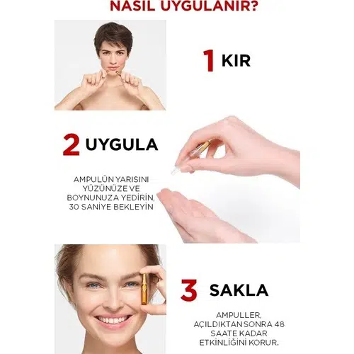 Kullanım Şekli:Akşamları yarım ampulü temizlenmiş cildinize masaj yaparak uygulayın.