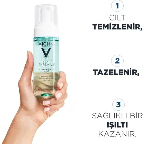 Cilde ışıltı veren yüz temizleyici köpük Hassas ciltler dahil tüm cilt tipleri için uygundur. Hipo-alerjeniktir.Güçlendirici ve yatıştırıcı Vichy Volkanik Suyu içerir.